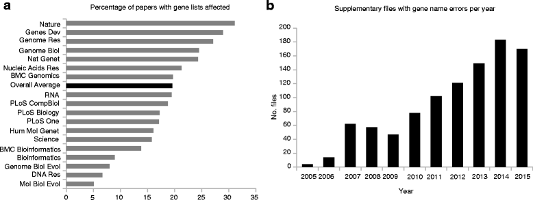 The spreadsheet software Microsoft Excel, when used with default settings, is known to convert gene names to dates and floating-point numbers. A programmatic scan of leading genomics journals reveals that approximately one-fifth of papers with supplementary Excel gene lists contain erroneous gene name conversions.