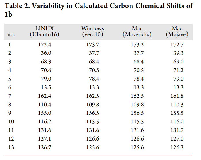 While preparing a manuscript, to our surprise, attempts by team members to replicate these results produced different calculated NMR chemical shifts despite using the same Gaussian files and the same procedure outlined by Willoughby et al. […] these conclusions were based on chemical shifts that appeared to depend on the computer system on which step 15 of that protocol was performed.