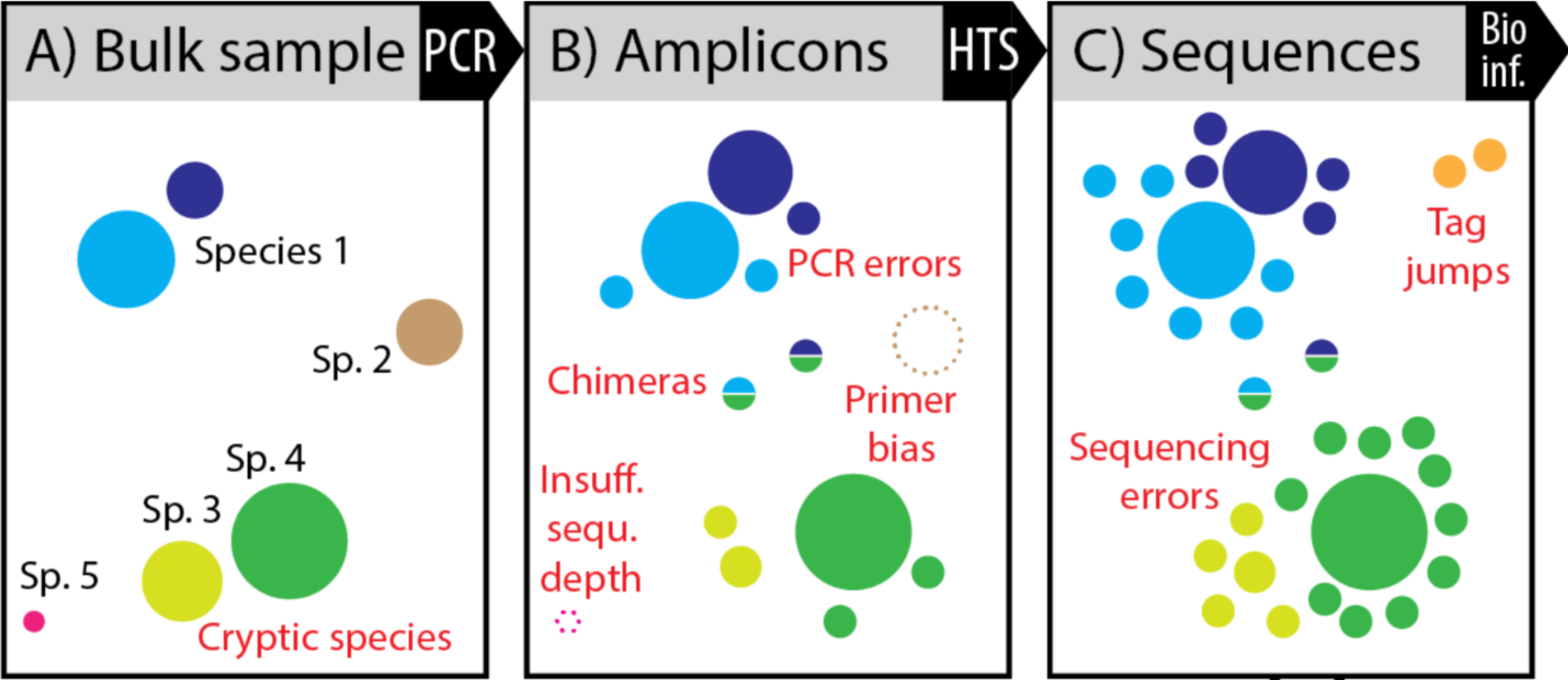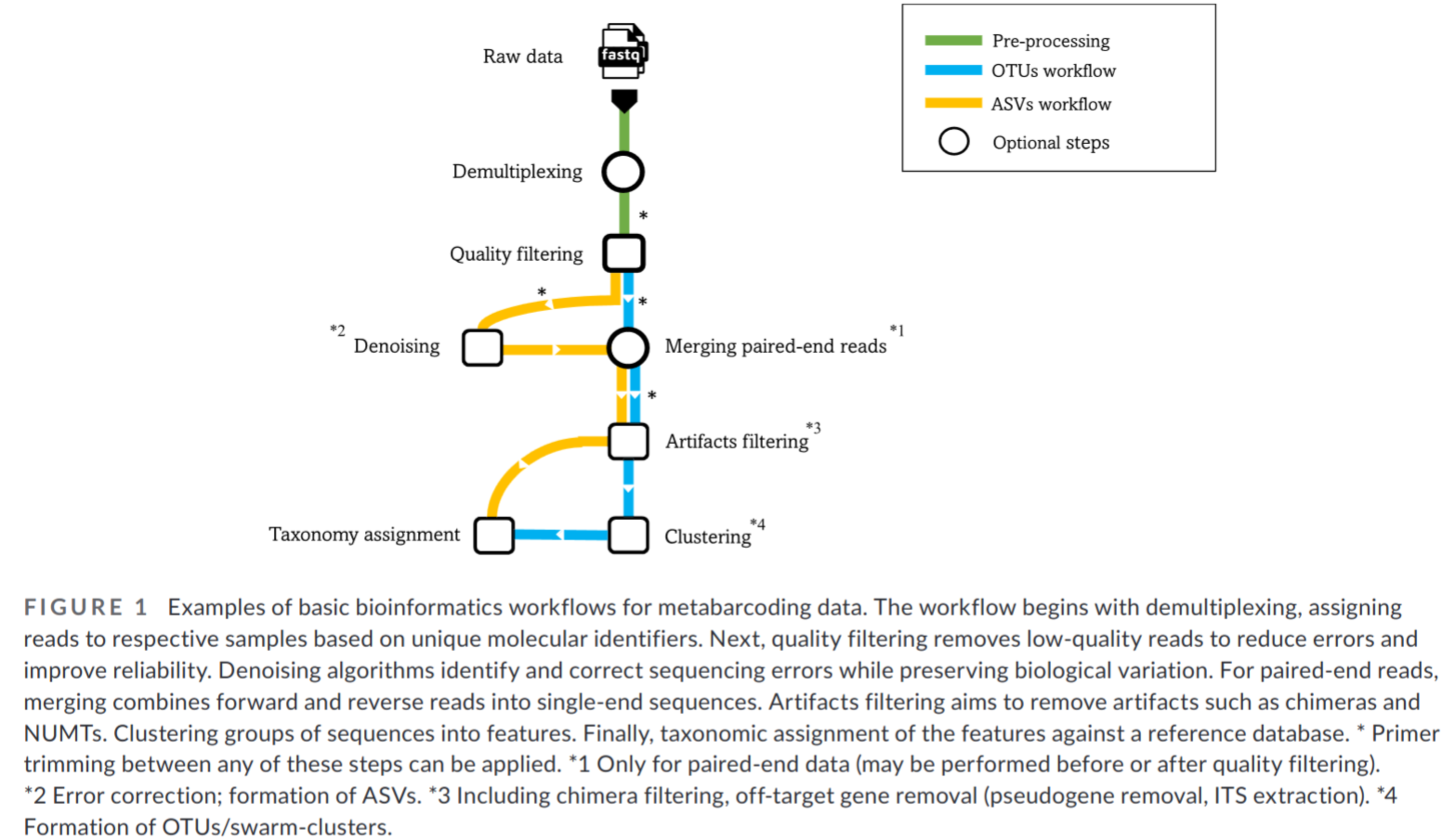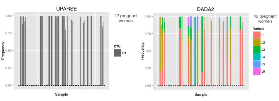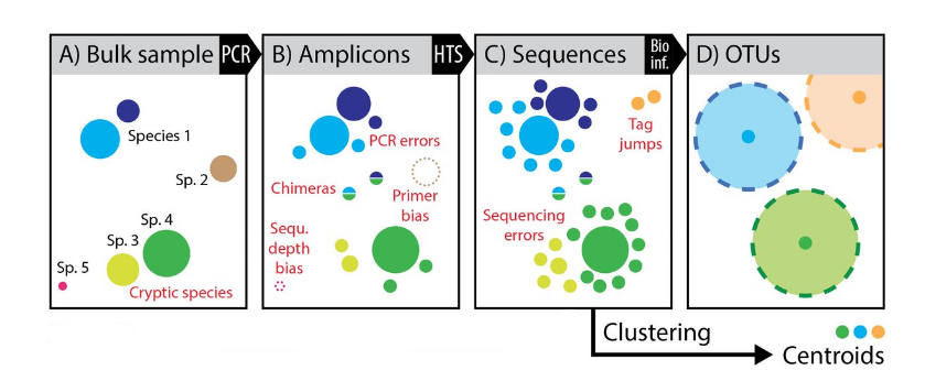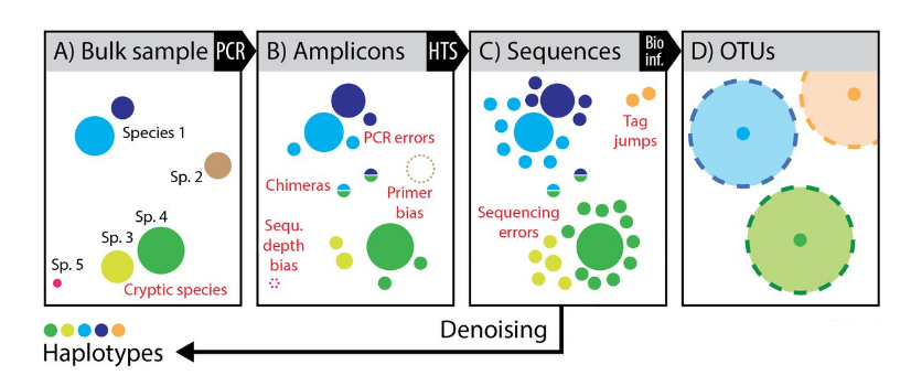 ASV are inferred by a de novo process in which biological sequences are discriminated from errors on the basis of the expectation that biological sequences are more likely to be repeatedly observed than are error-containing sequences