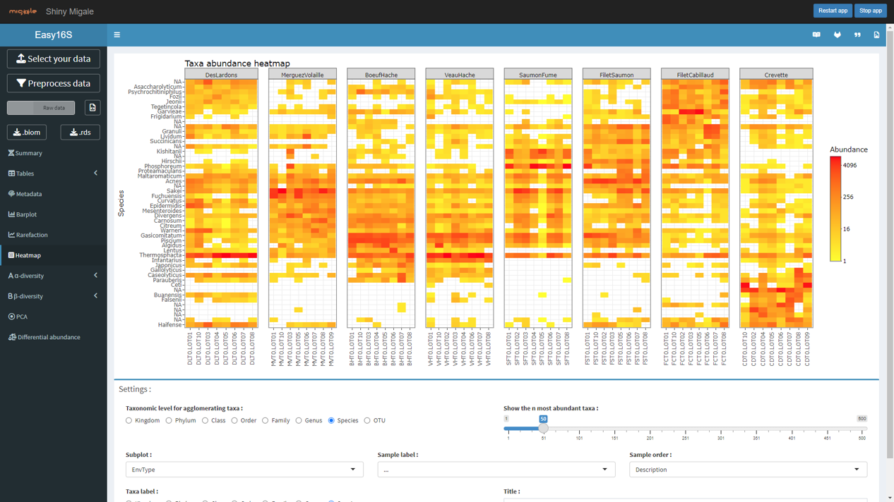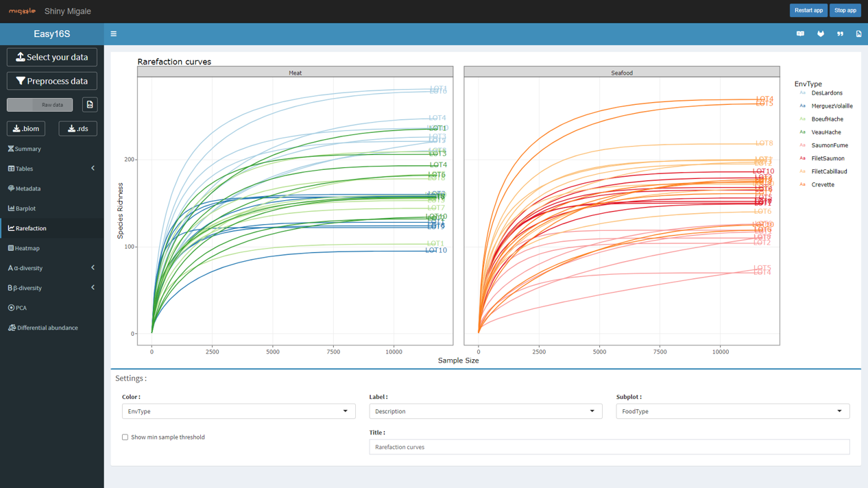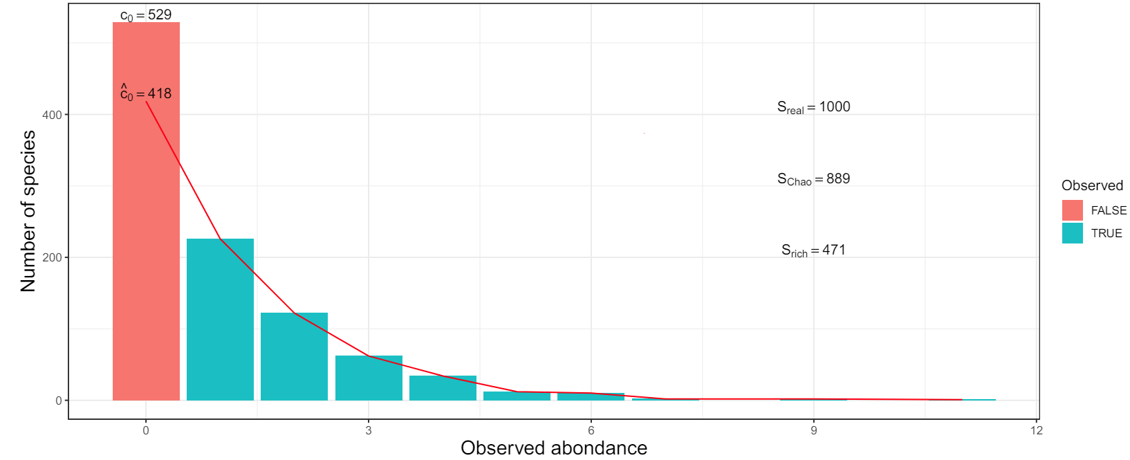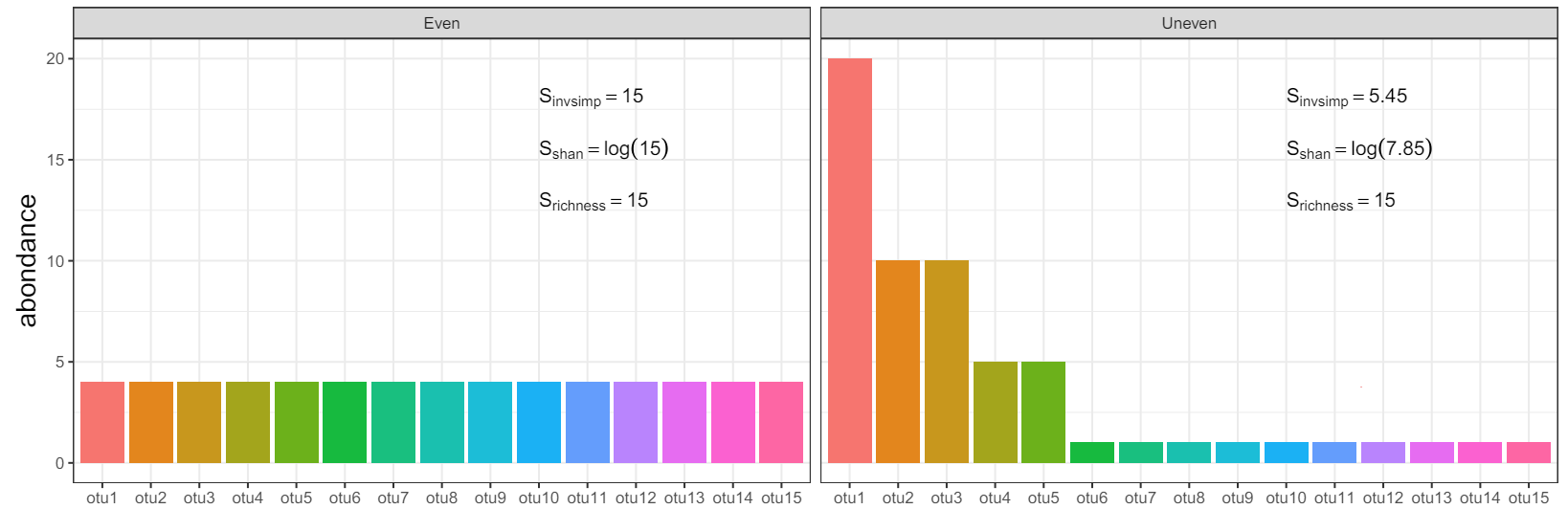 Note \(c_i\) the number of species observed \(i\) times (\(i = 1, 2, \ldots\)) and \(p_s\) the proportion of species \(s\) (\(s = 1, \ldots, S\))