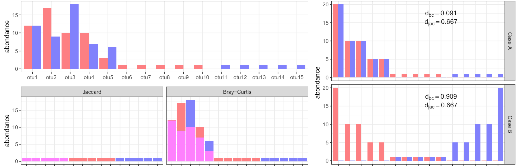Note \(\color{red}{n_s^1}\) the count of species \(s\) (\(s = 1, \ldots , S\) ) in \(\color{red}{community \space 1}\) and \(\color{blue}{n_s^2}\) the count in \(\color{blue}{community \space 2}\).