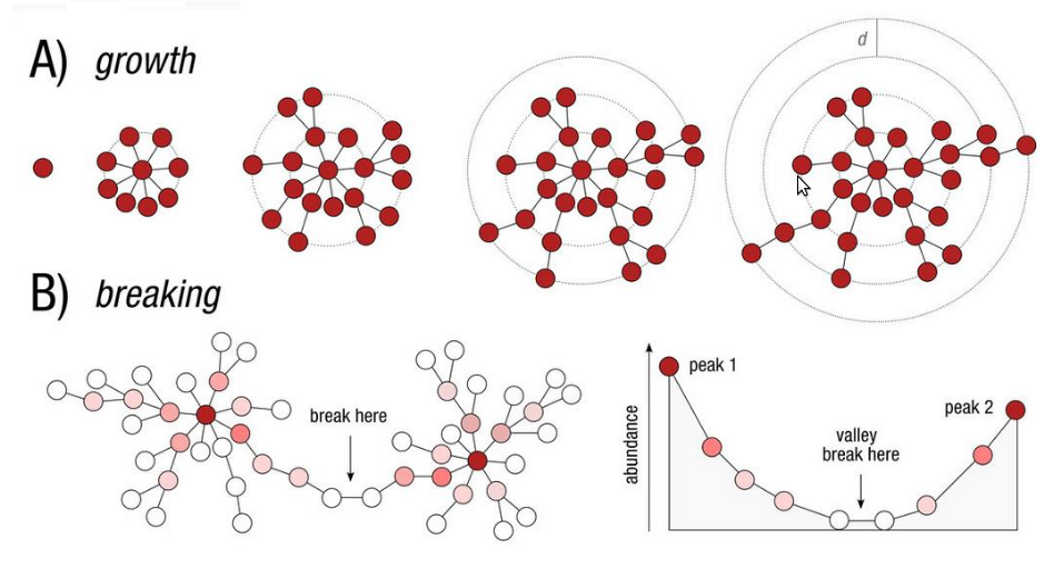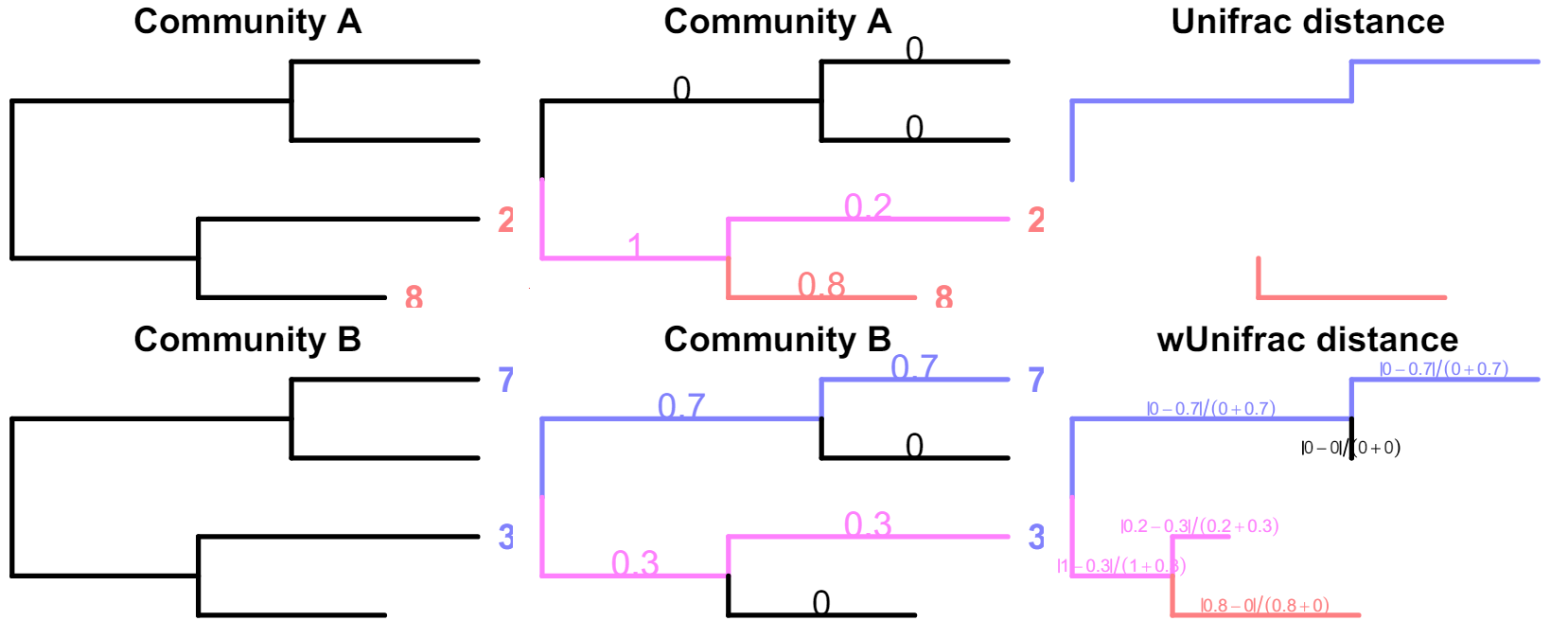 For each branch \(e\), note \(l_e\) its length and \(\color{red}{p_e}\) (resp. \(\color{blue}{q_e}\)) the fraction of \(\color{red}{community \space 1}\) (resp. \(\color{blue}{community \space 2}\)) below branch \(e\).