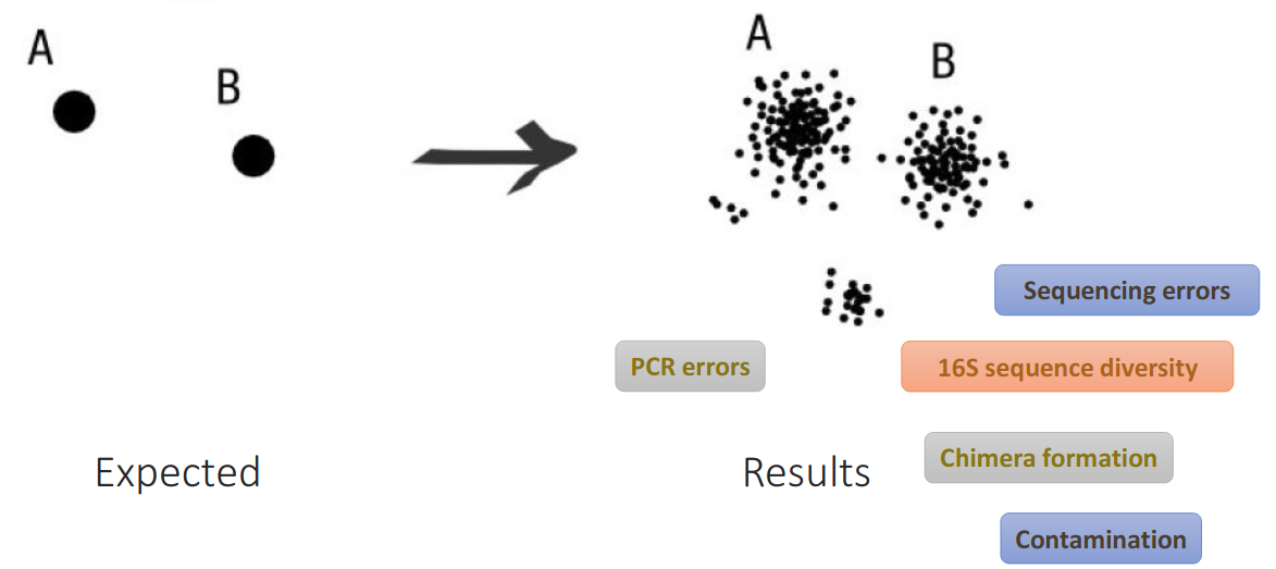 ASVs are identical denoised reads with as few as 1 base pair difference between variants, representing an inference of the biological sequences prior to amplification and sequencing errors.